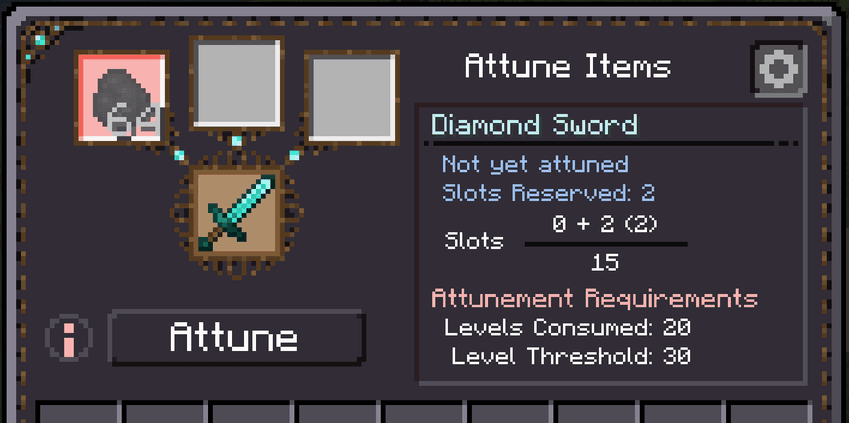 - Make older tier / less powerful items more desirable. Now instead of getting rid of your iron sword in favor of a diamond one you could attune the iron sword and gain special benefits as you bond with it. As you increase the attunement levels with it it could gain more damage and attack speed, along with it becoming unbreakable and soulbound. Throw on some enchantments and you could create a very powerful item! Diamond swords may also be attuneable but gain different benefits at different levels, or may not be attuneable at all. This creates an interesting item economy, gives value to different tiers of items, and gives more balancing options to modpack makers.