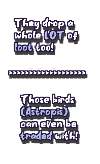 This bag came to life of result of some black magic, and as of it, carries objects lost by previous people and mobs! They spawn in dark places and are called the "Raggied" and next to it is the "Astropi" a bird civilization that lives in the skies and in trees. They are immune to lightning!