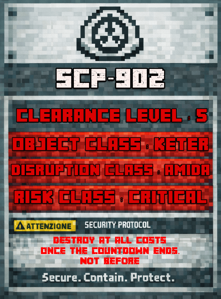 SCP-902, its documentation, and its label can only be found inside the SCP-902 containment chamber structure.